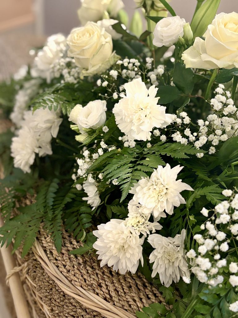 Our curated collection includes traditional funeral wreaths, casket sprays, and funeral sheaves, as well as elegant posies, crosses, roses and bouquets. Popular choices feature serene white lilies, soft pink roses, and seasonal flowers in calming whites, creams, and greens — each arrangement carefully designed to reflect peace and remembrance.